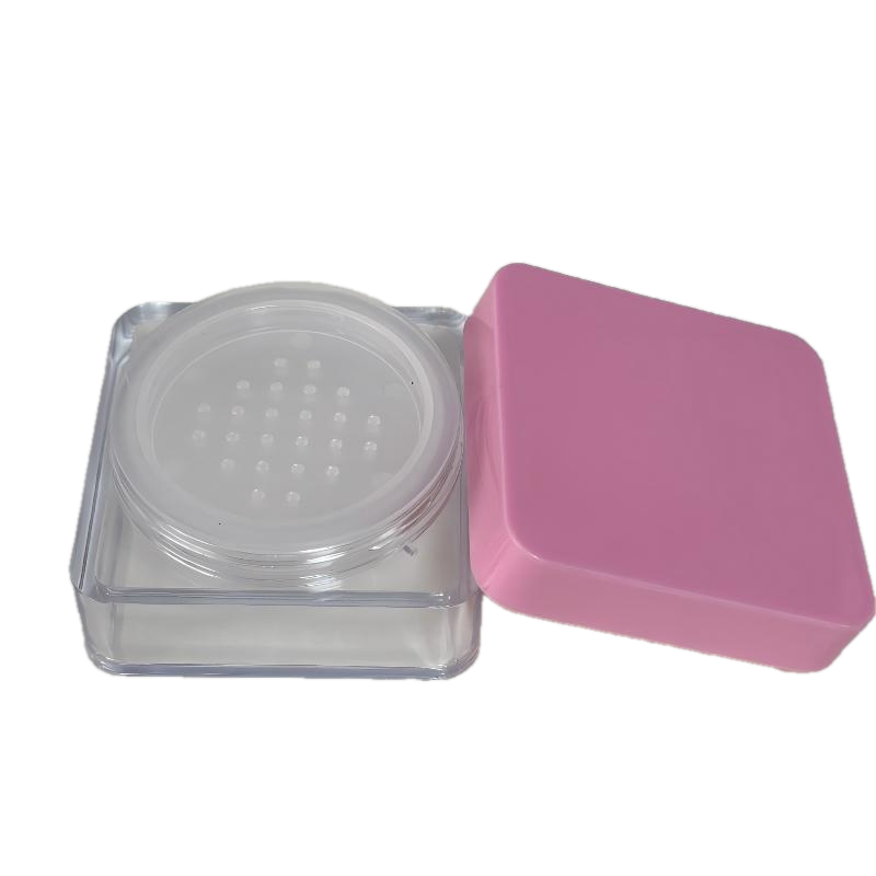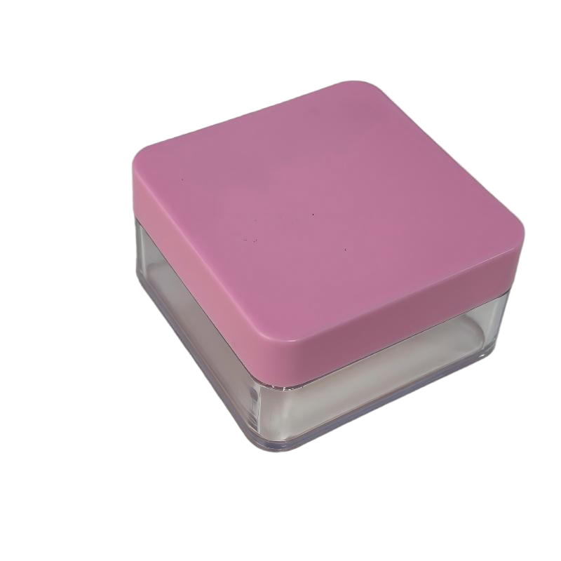The 2521 loose powder compact features a transparent plastic body with a pink lid, presenting a sleek and contemporary aesthetic. Its interior incorporates multiple small holes, facilitating precise control over powder dispensing to minimise waste.